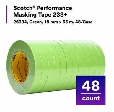 Scotch® Performance Green Masking Tape 233+ delivers consistently superior performance on moldings, plastic, glass, metal, rubber and paint. Balanced four-part construction includes flexible backing that applies easily around vehicle curves and contours and the patented adhesive that sticks at a touch, stays put and removes without transfer for consistently outstanding paint lines.