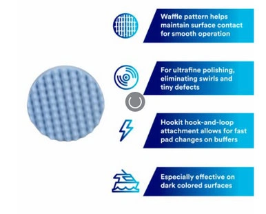The 3M Perfect-It™ Ultrafine Polishing Pad helps to eliminate swirl marks on painted surfaces, even on difficult dark colored cars. Featuring a unique waffle face design that holds liquid polish, this pad applies polish evenly without releasing excess polish that may cause ripples in the finish.