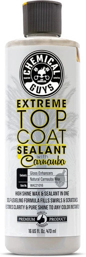 Extreme Top Coat Wax & Sealant with Carnauba by Chemical Guys provides long-lasting protection and a brilliant, deep gloss finish. Formulated with premium carnauba wax and advanced sealant polymers, this top coat enhances color depth while shielding paint from harmful UV rays, water spots, and contaminants. The easy-to-apply formula glides on smoothly and buffs off effortlessly, leaving a slick, mirror-like finish on all colors and paint types. Ideal for detailers who demand durability and shine, Extreme Top Coat Wax & Sealant delivers showroom results with the protective power of carnauba.
