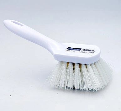8 1/2" Solid Plastic Block White Nylon Fender Brush's filling material is staple set in a polypropylene block.nbsp;Will not break or crack. Will not absorb water. Angled handle prevents scraped knuckles. Recommended for use in the food industry. Not recommended for use in acid solutions.