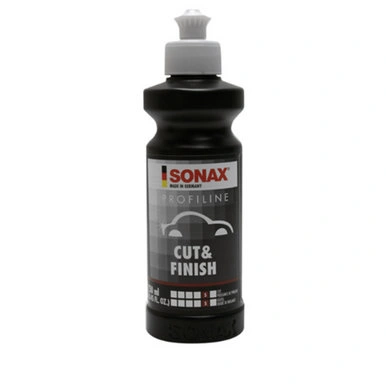 SONAX Cut and Finish is an innovative polish with an intense abrasive effect for quickly eradicating defective spots, such as dust occlusion, paint overspray and sanding marks following repair spraying. High abrasion with simultaneous good degree of shine, workable for a long time, with outstanding wipe off feature. Ideal for polishing sanded down surfaces. Removes sanding grooves made by P1500 abrasive paper. Silicone-free.